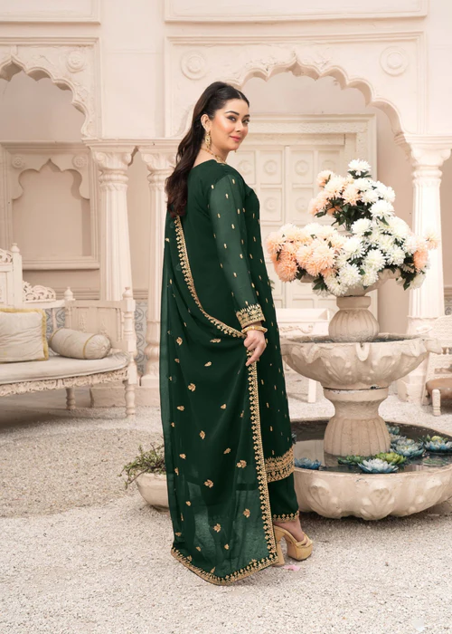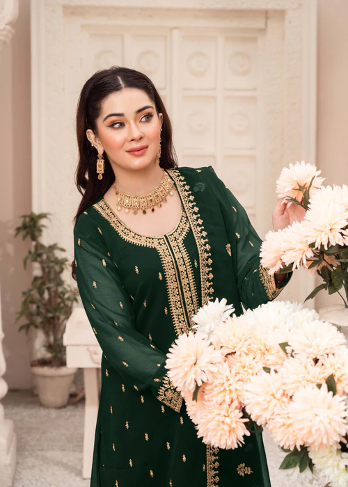Elevate your festive and party wardrobe with this elegant dark green embroidered chiffon kurta set, thoughtfully designed to reflect grace, sophistication, and timeless style. Perfect for weddings, festive celebrations, and special gatherings, this 3-piece Eastern ready-to-wear outfit beautifully blends traditional craftsmanship with modern comfort.