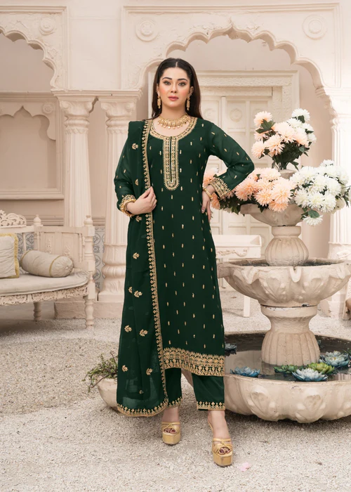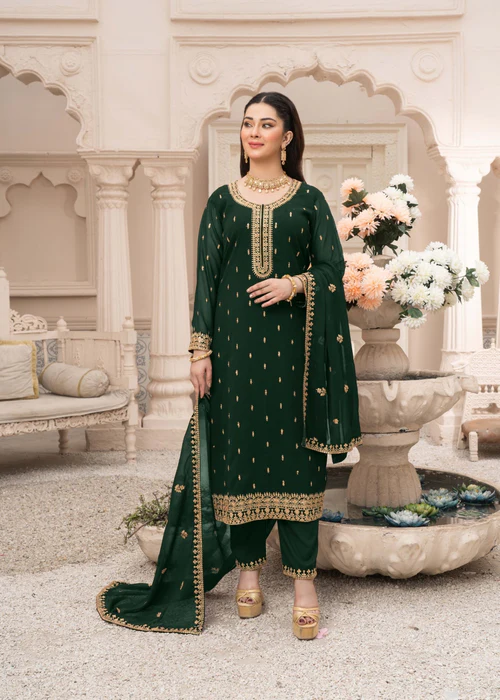 Whether you’re searching for a dark green festive kurta set, an embroidered chiffon party wear outfit, or a luxury 3-piece Eastern dress, this ensemble is crafted to leave a lasting impression.