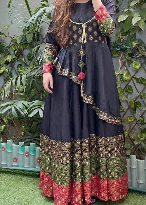 Gul Bano 4pc 0053 – 1 Mahoor Haven 🖤 Black Asymmetrical Maxi Set – 4 Piece Printed Festive Silk Ensemble | Brands Discovery Pakistan