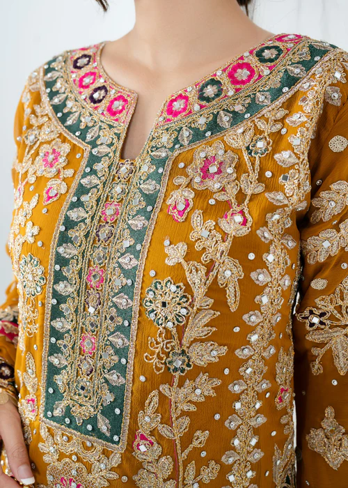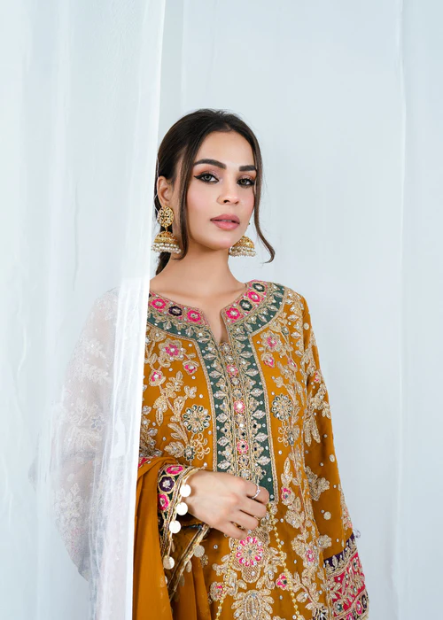 Introducing Meena, an exquisite 4-piece embroidered chiffon kurta set designed for weddings and formal occasions. This stunning ready-to-wear ensemble radiates charm through its beautiful multi-colored embroidery, blending traditional artistry with modern sophistication.